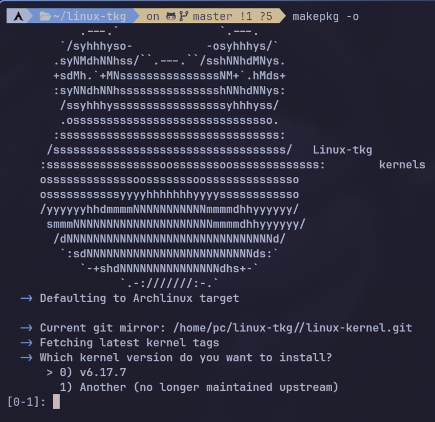 cd linux-tkgNow run the makepkg -o or makepkg -s command and follow the instructions of the linux-tkg next.