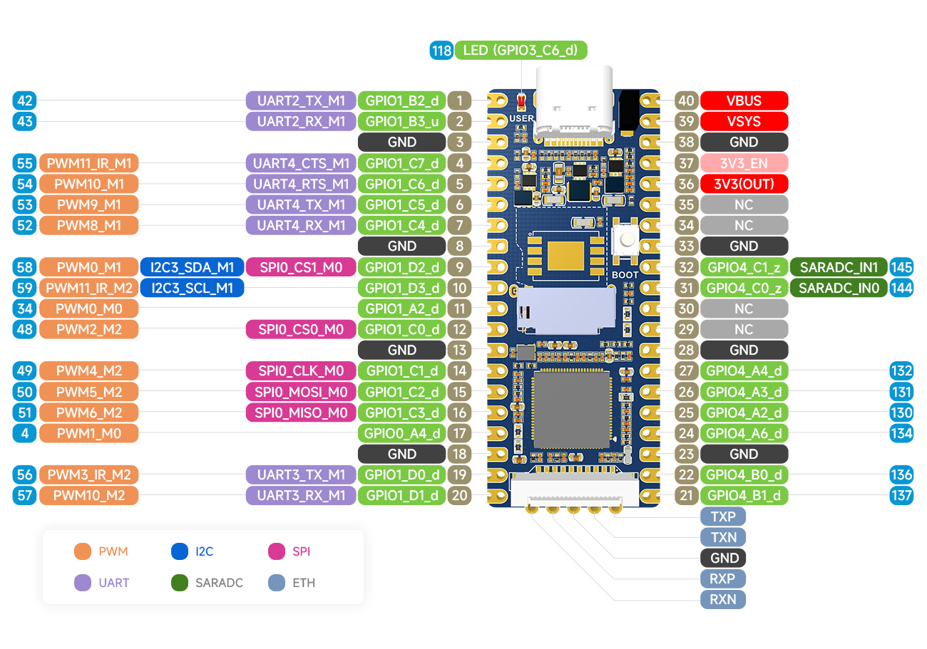 For power, although the board can be powered via USB-C, it is also possible to do so via the VBUS and GND pins, corresponding to numbers 40 and 38 in the previous diagram.